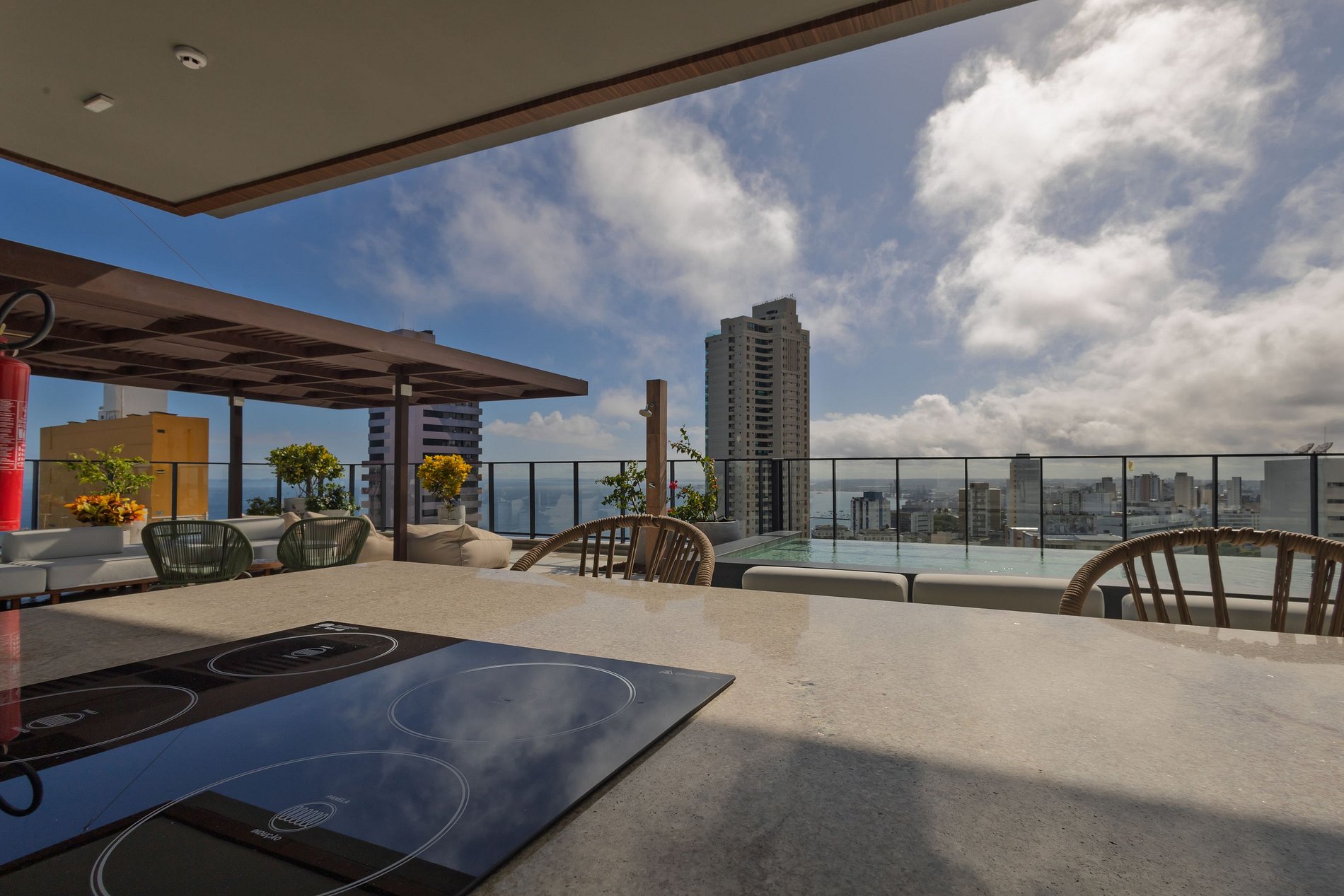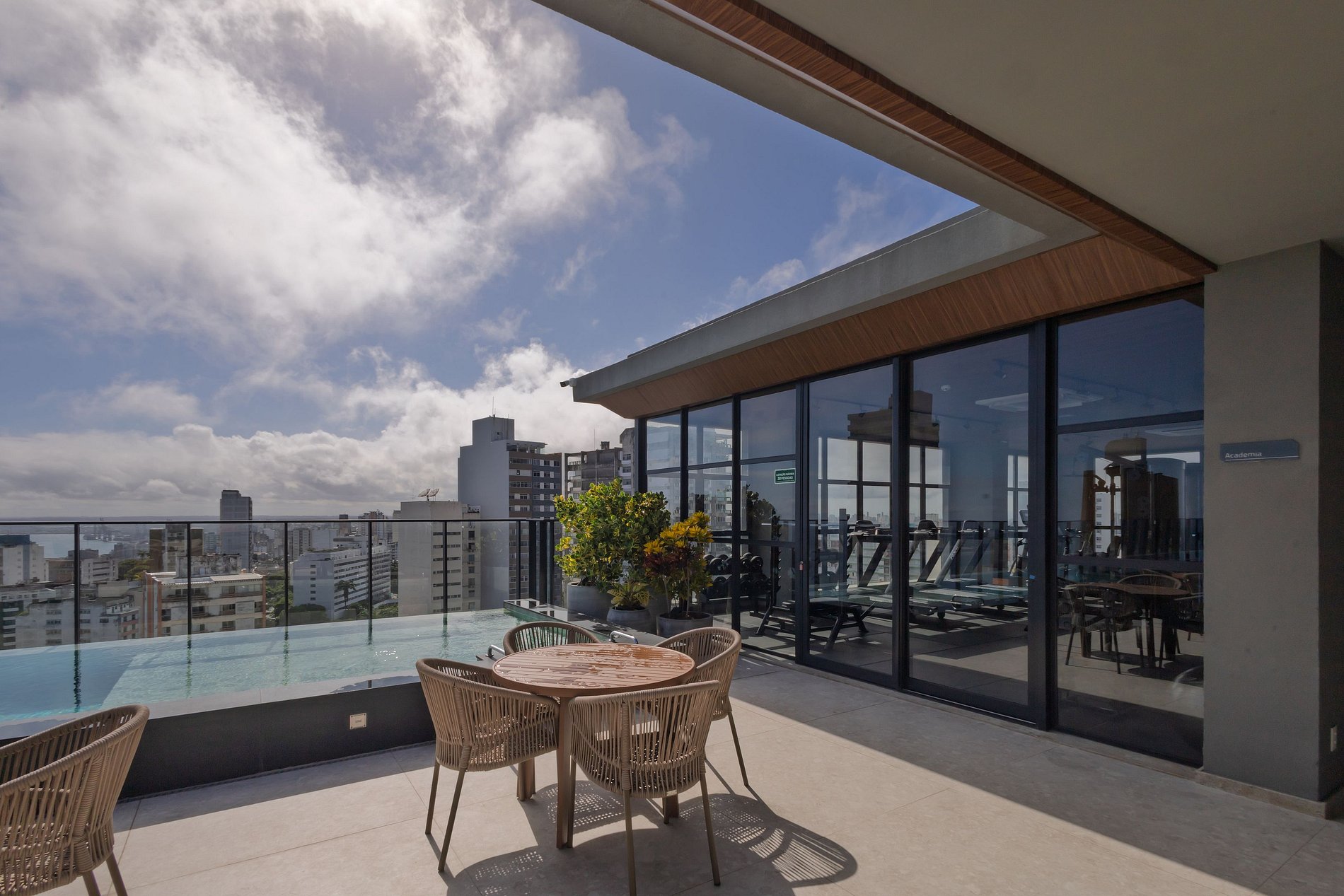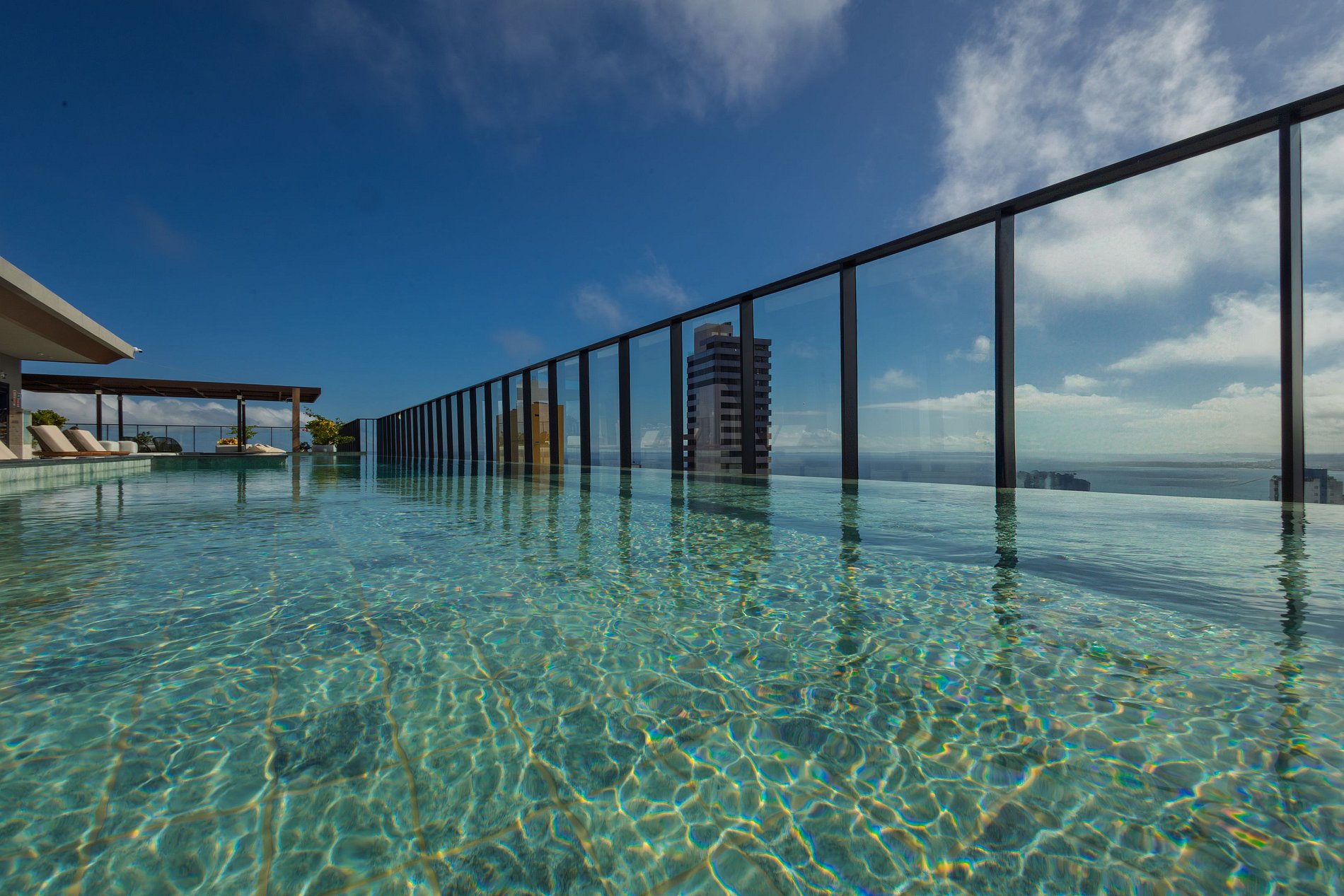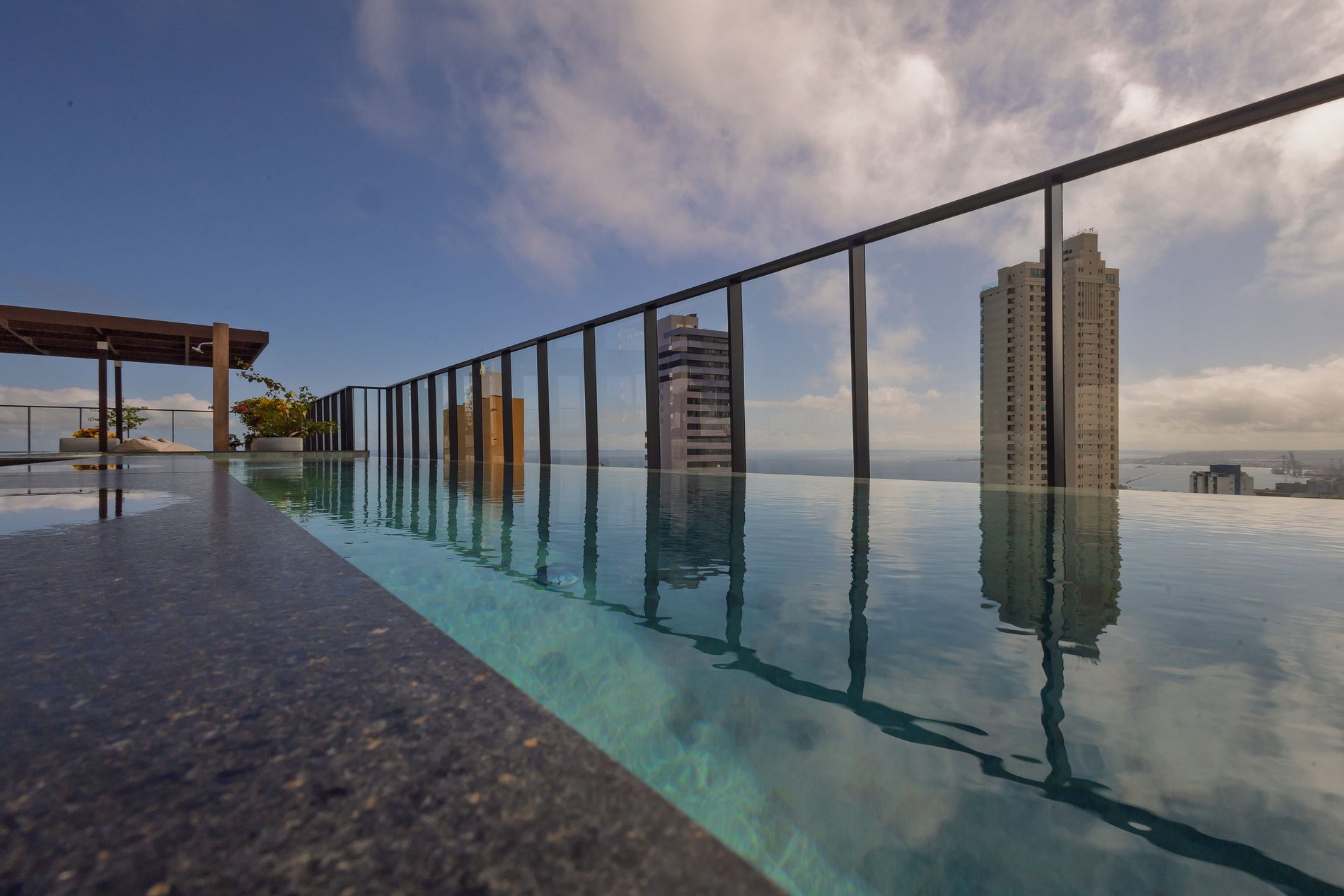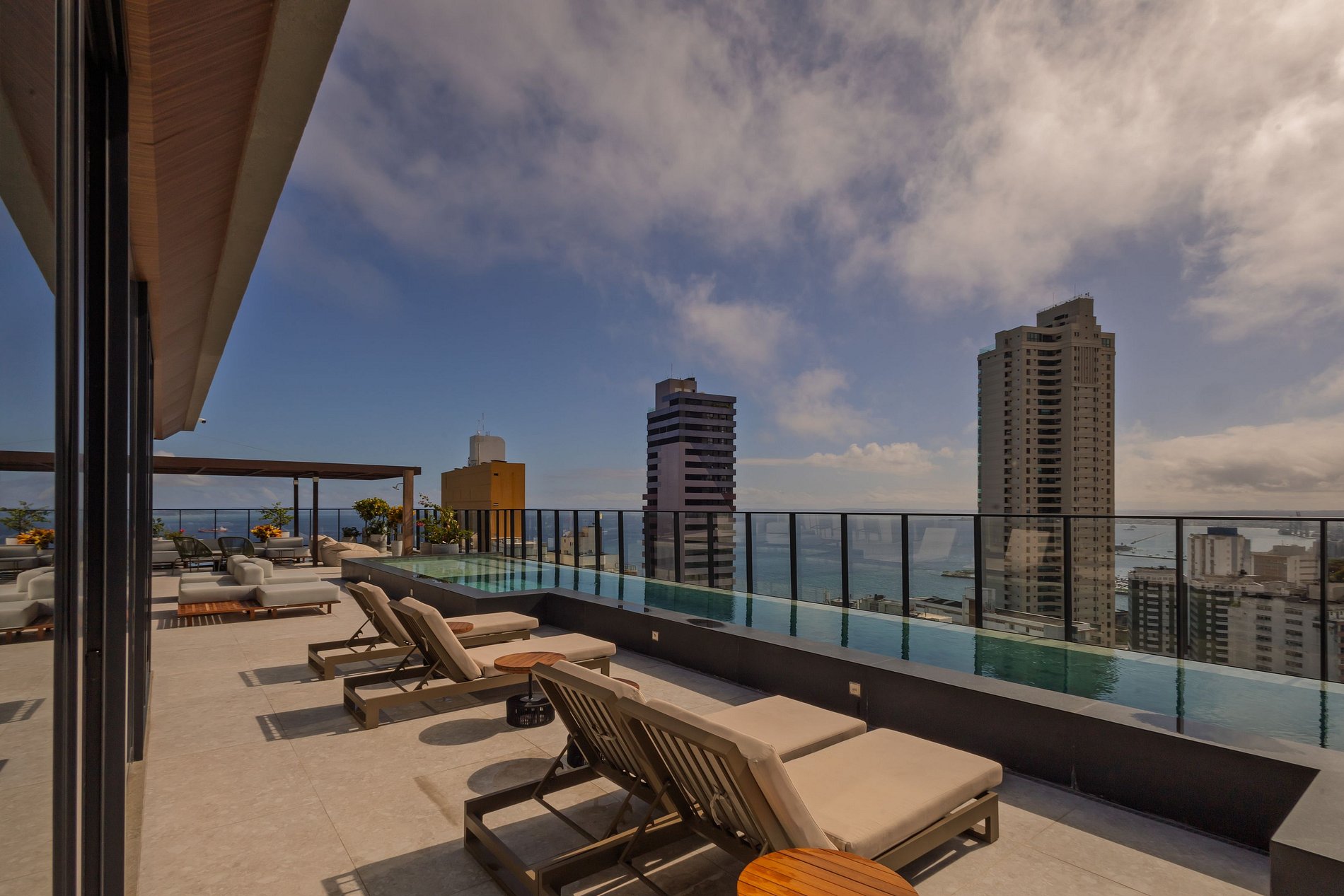 Rooftop com Sky Lounge: Área de lazer no topo do edifício, oferecendo piscina com borda infinita, espaço gourmet e vista panorâmica da Baía de Todos os Santos.